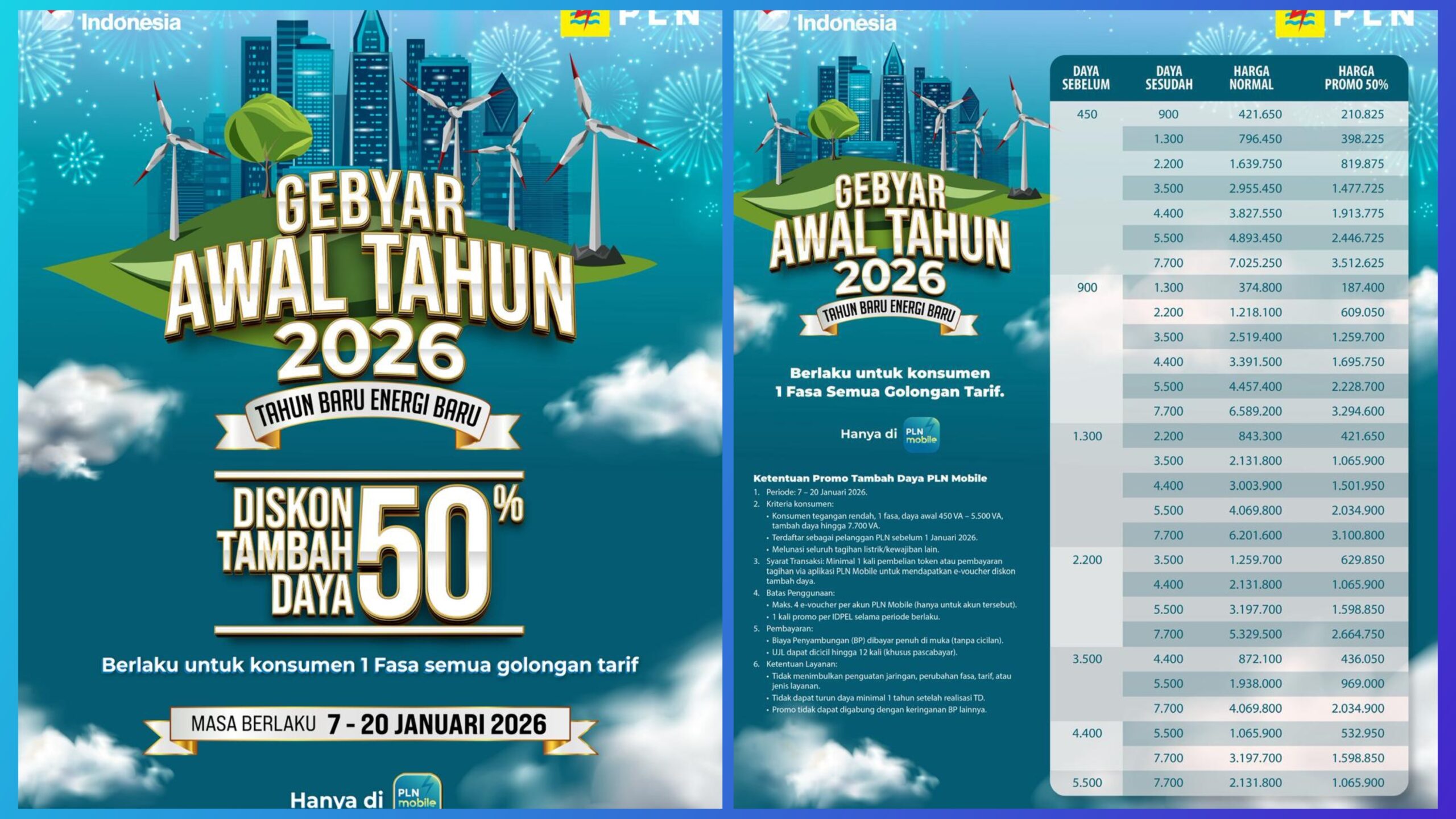 Program ini menjadi solusi hemat bagi masyarakat yang membutuhkan peningkatan kapasitas listrik rumah tangga, sekaligus mendorong pemanfaatan layanan digital melalui aplikasi PLN Mobile.Promo ini berlaku mulai 7 hingga 20 Januari 2026 dan dapat diakses dengan mudah, cepat, serta transparan melalui aplikasi PLN Mobile.